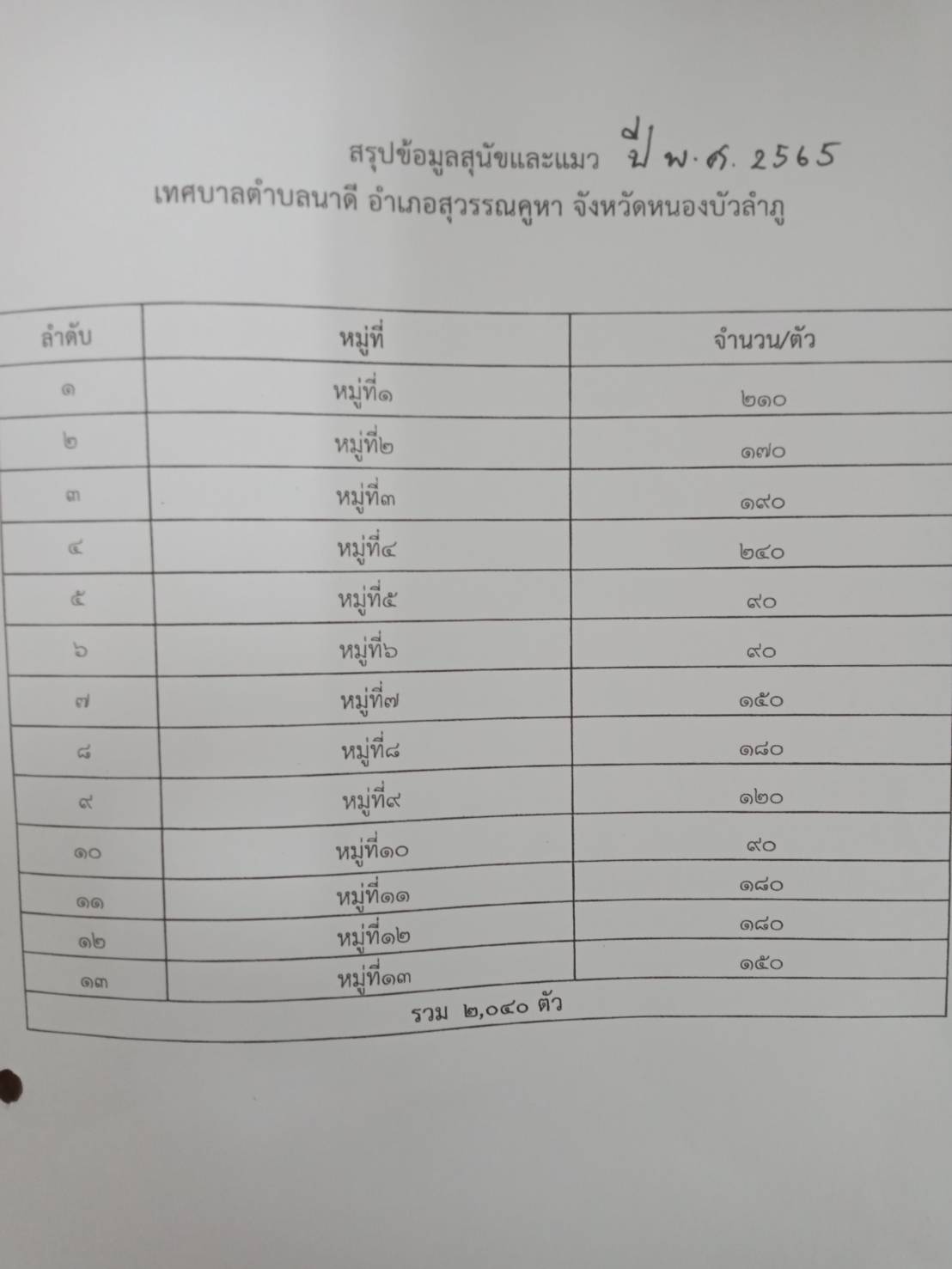 ข้อมูลสุนัขและแมวในเขตเทศบาลตำบลนาดี ปี พ.ศ. 2565