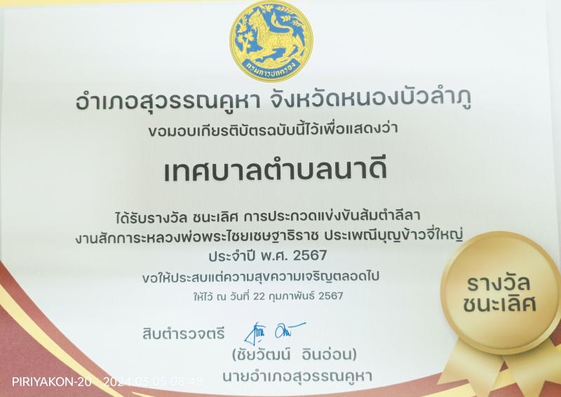 เทศบาลตำบลนาดีชนะเลิศการประกวดส้มตำลีลา ในงานสักการะหลวงพ่อพระไชยเชษฐาธิราช บุญข้าวจี่ใหญ่ ณ วัดถ้ำสุวรรณคูหา ประจำปี พ.ศ.2567