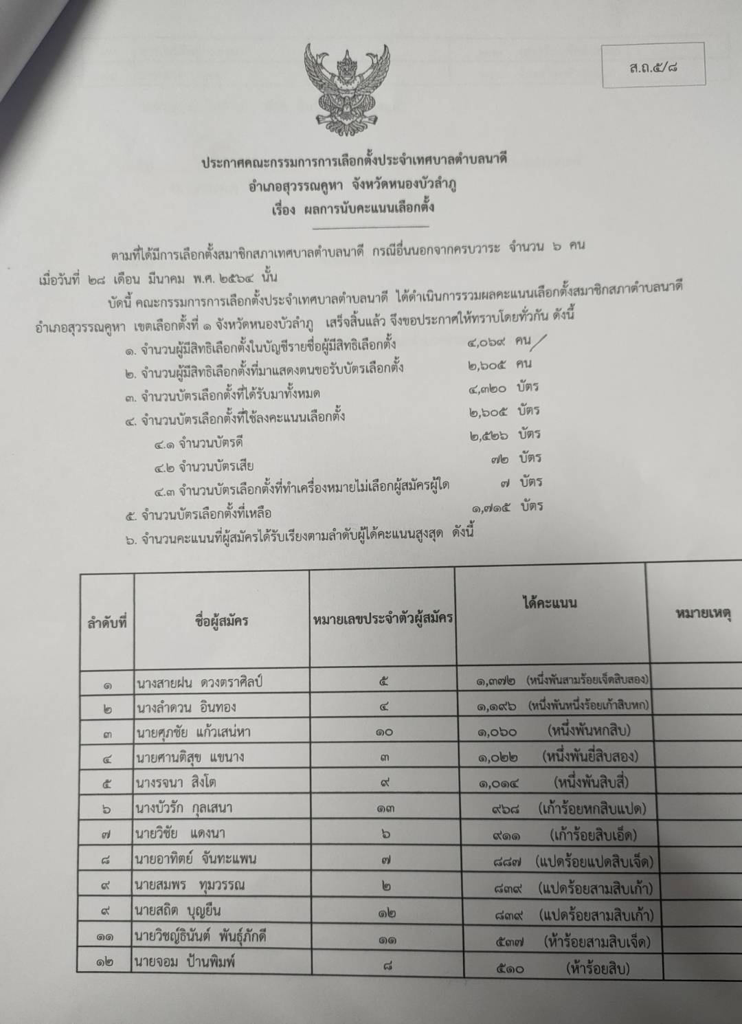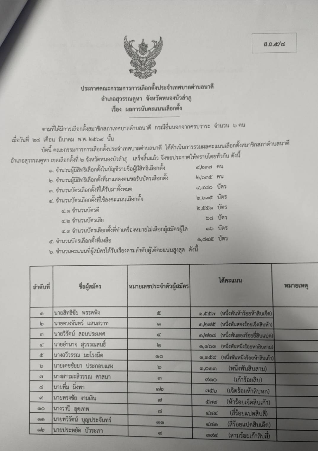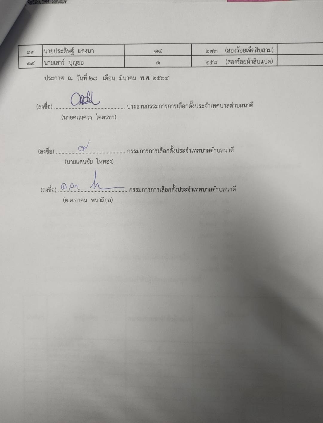 ประกาศคณะกรรมการการเลือกตั้งประจำเทศบาลตำบลนาดี เรื่อง ผลการนับคะแนนเลือกตั้ง (อย่างไม่เป็นทางการ)