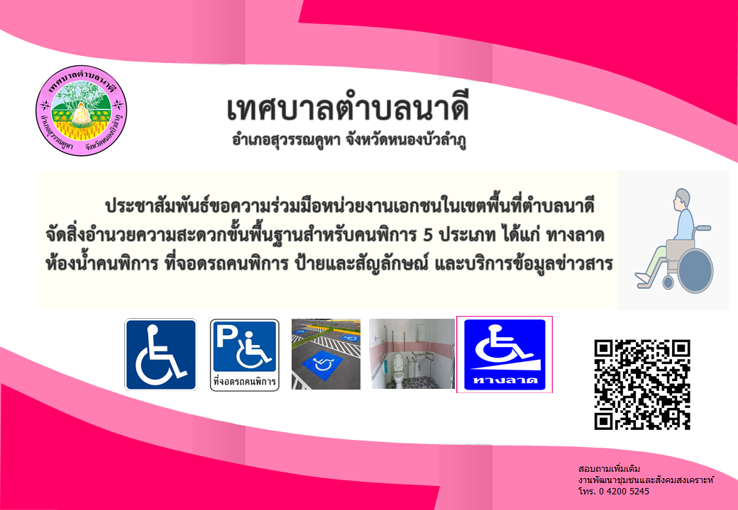 ชื่อเรื่อง : ประชาสัมพันธ์ขอความร่วมมือหน่วยงานเอกชนในเขตพื้นที่ตำบลนาดีจัดสิ่งอำนวยความสะดวกขึ้นพื้นฐานสำหรับคนพิการ 5 ประเภท ได้แก่ ทางลาดห้องน้ำคนพิการ ที่จอดรถคนพิการ ป้ายและสัญลักษณ์ และบริการข้อมูลข่าวสาร