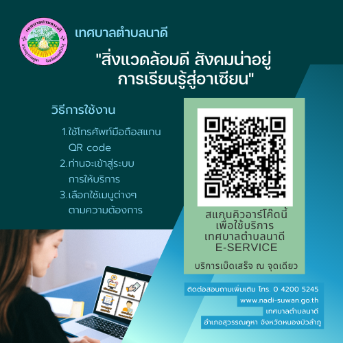 ประชาสัมพันธ์คิวอาร์โค๊ดการให้บริการ E-service เทศบาลตำบลนาดี ทุกท่านสามารถเพิ่มเพื่อนในระบบไลน์แล้วแชทเข้ามาเลือกใช้บริการต่างๆได้เลยค่ะ