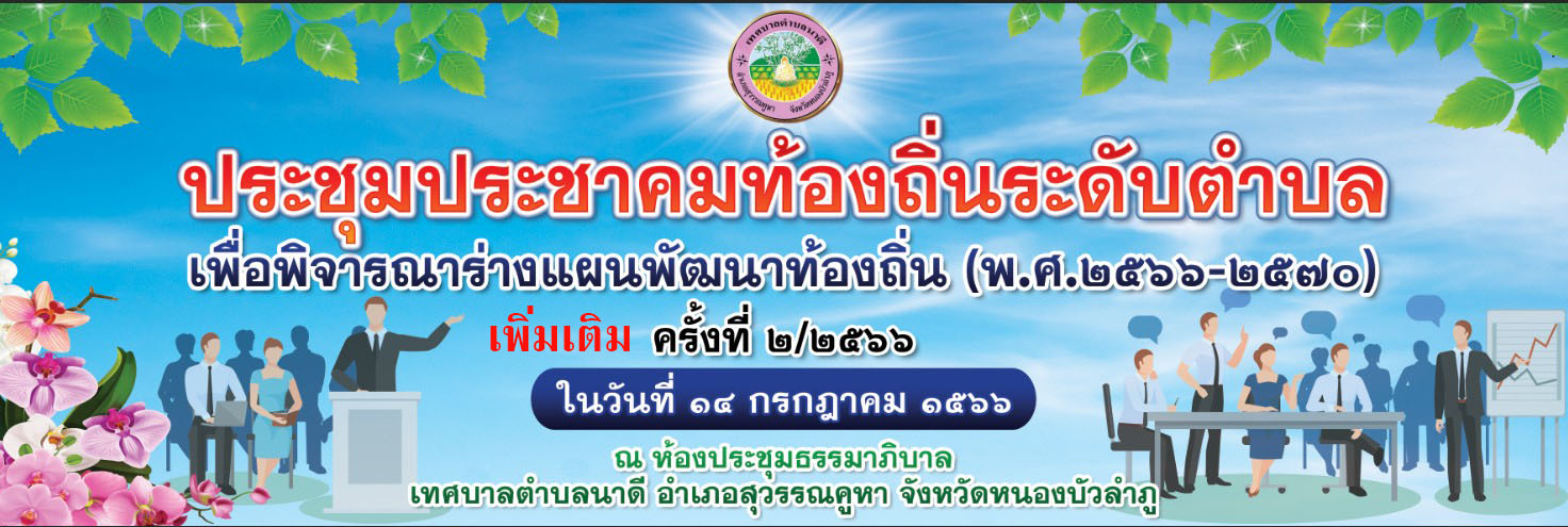 14 ก.ค. 2566 เวลา 09.30 น. ขอเชิญสัดส่วนประชาคมท้องถิ่นระดับตำบล และผู้ที่สนใจทุกท่าน เข้าร่วมการประชุมประชาคมท้องถิ่นระดับตำบล เทศบาลตำบลนาดี ณ ห้องประชุมธรรมาภิบาล