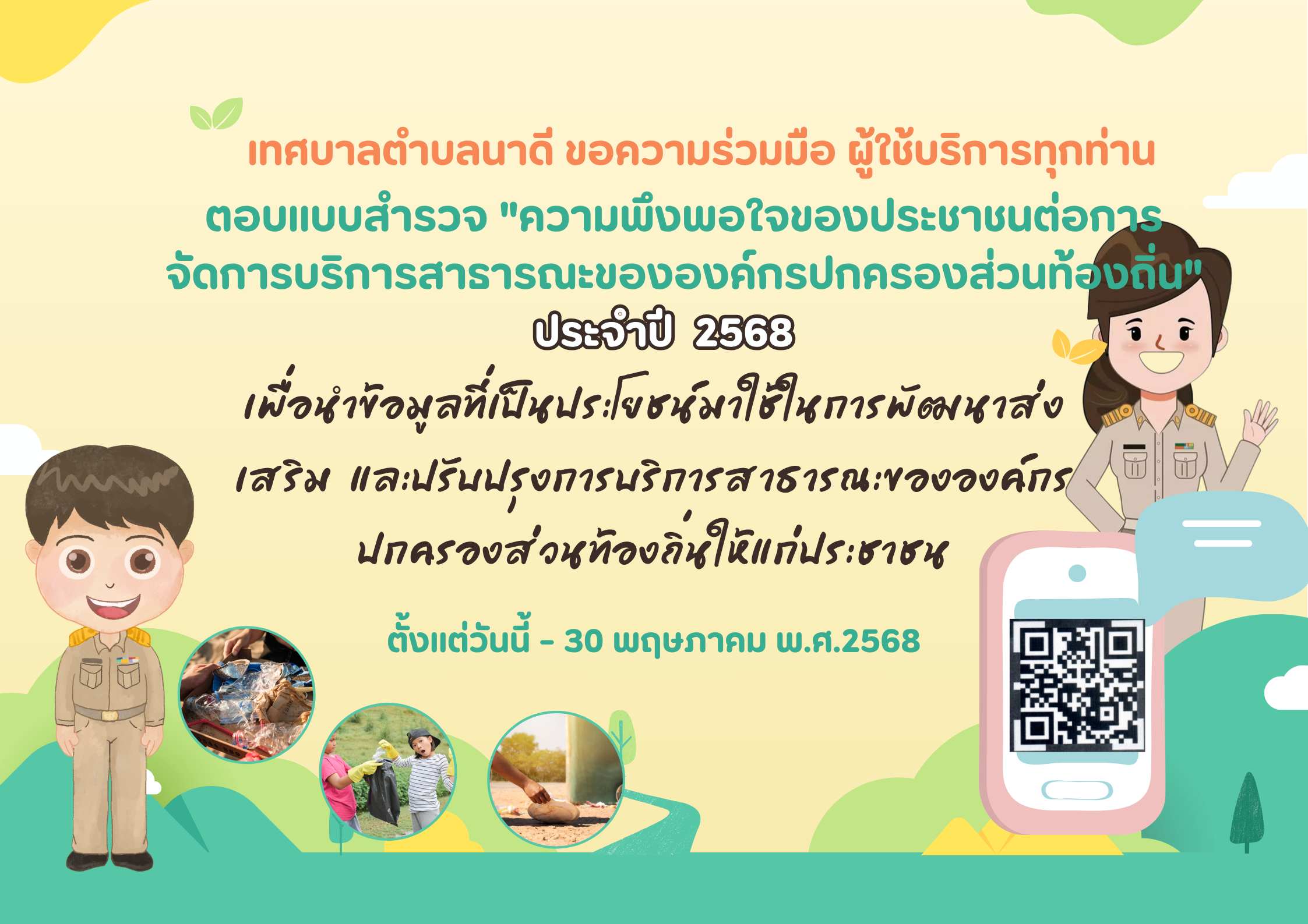 ชื่อเรื่อง : เทศบาลตำบลนาดี ขอความร่วมมือ ผู้ใช้บริการทุกท่าน ตอบแบบสำรวจ "ความพึงพอใจของประชาชนต่อการจัดการบริการสาธารณะขององค์กรปกครองส่วนท้องถิ่น" เพื่อเป็นแนวทางให้เทศบาลตำบลนาดีนำไปพัฒนา ส่งเสริม และปรับปรุง การให้บริการต่อประชาชนต่อไป